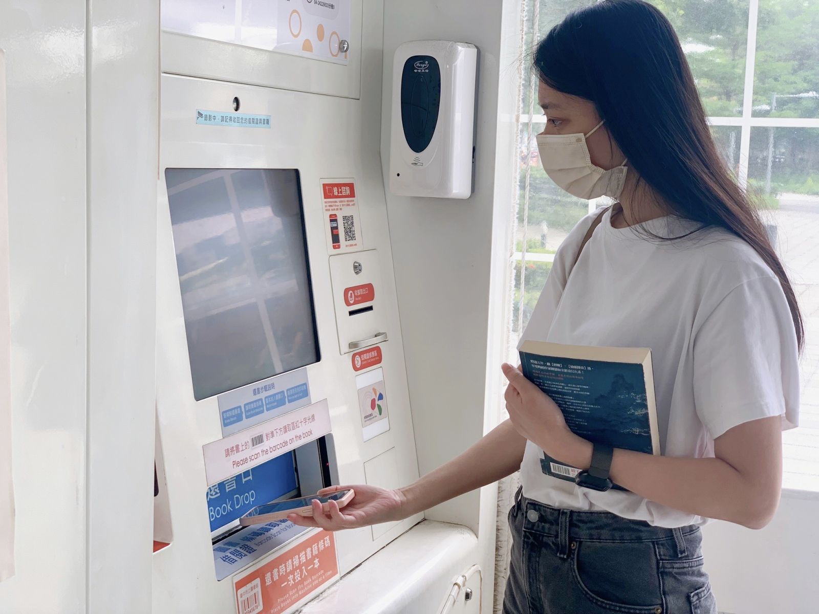 ▲捷運松竹自助借還書站,每日更新熱門圖書並提供預約取書。