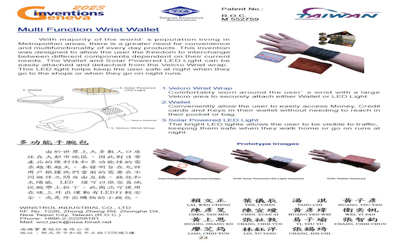 獲獎單位指出,由於世界上大多數人口居住在大都市地區,因此對日常產品的便利性和多功能性的需求越來越大。 「多功能手腕包」可允許用戶根據他們當前的需要在不同組件之間自由互換。錢包和太陽能 LED 燈可以很容易地從腕帶上拆下,此發明作品可使用在晚上外出運動有太陽能LED灯照明較安全,或是外出購物的小錢包等多功能便利性。