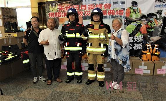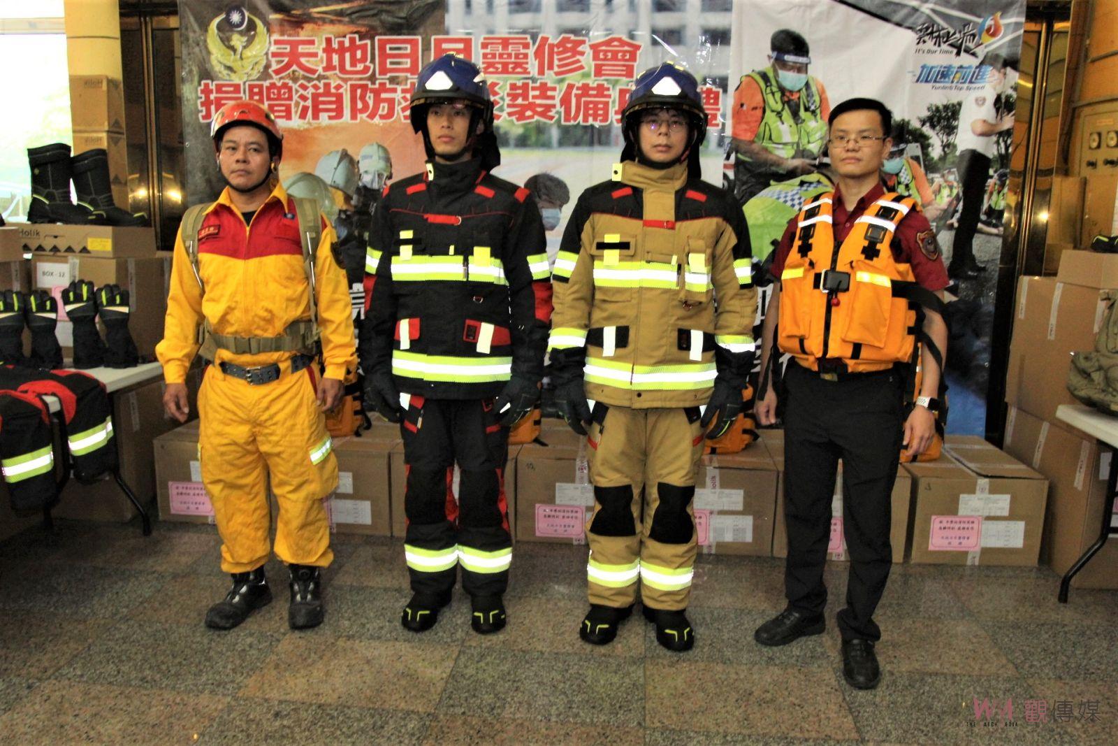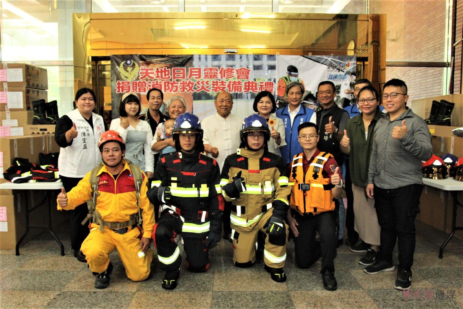 ▲天地日月靈修會捐贈雲林縣消防局一批消防衣帽鞋、急流救生衣和特種搜救隊個人背包等援救災裝備。