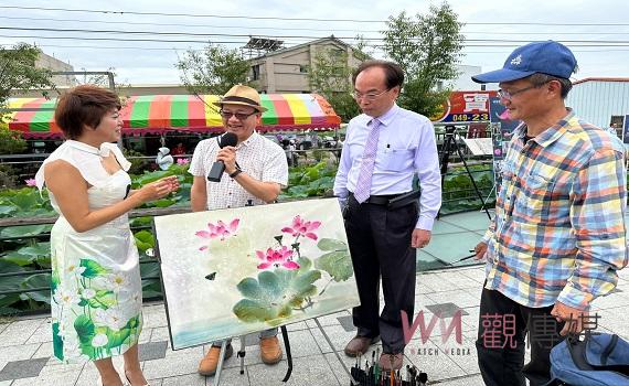 (觀傳媒南投新聞)【記者石振賢/南投報導】南投縣知名企業家、詠基建設負責人戴聰和,上周行經中興新村大門入口處荷花池,驚豔於荷花盛開、美不勝收,心想有這麼漂亮的景致,應該推薦給國人知道。喜歡藝術的他,當下立即與南投縣美術學會理事長洪春成聯絡,在短短六天時間內,從開會策畫,到付之實現,「詠荷藝術創作-語荷共舞·中興新村荷花季,藝術巨匠公益創作」活動,十五日上午熱鬧揭幕。