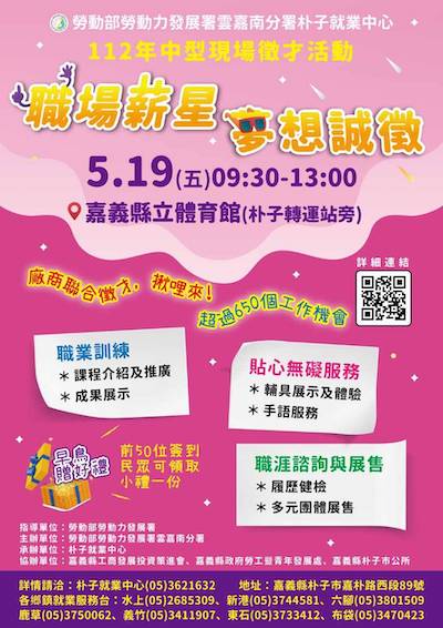 朴子就業中心表示,畢業求職旺季來臨,5月19日(五)09:30-13:00在縣立體育館徵才,希望能幫畢業青年找到好工作,也幫廠商媒合好人才,此次活動特別邀集在地廠商設攤徵才,500多個職缺不限經驗,提供畢業新鮮人應徵,歡迎應屆畢業生、青年朋友或想轉職的民眾趕快來卡位,一起回嘉工作。