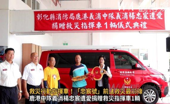 ▲已故鹿港義消中隊助理幹事楊忠宸遺愛人間,四位兄長以其名義捐出造價276萬消防救災指揮車,彰化縣長王惠美代表受贈,捐贈場面溫馨隆重。