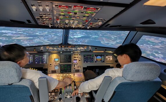 ▲朝陽科大飛航系斥資千萬引進空中巴士A320模擬機,駕駛艙設備皆仿真機製作,讓學生體驗飛行。