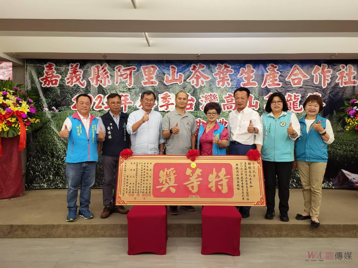 (觀傳媒嘉義新聞)【記者邱嘉琪/嘉義報導】阿里山茶葉生產合作社2023春季優良茶競賽5月29日舉行,成績當日揭曉,17日上午在仁義湖岸大酒店舉行頒獎典禮,縣長翁章梁親自頒獎表揚,其中青心烏龍組特等獎由賴正一製茶─賴新日奪得,新品種金萱組特等獎由丁式茶─鍾明志拿下,立委陳明文、王美惠出席恭賀。合作社理事主席蔡惠櫻當場開放競標特等茶,最後以6萬元成功標出,合作社另加碼10萬共16萬,全數捐予年終社會局寒冬送暖做公益。