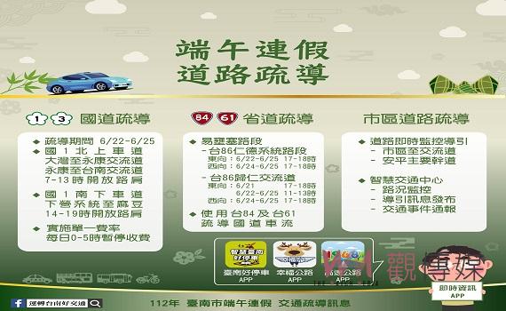 (觀傳媒台南新聞)【記者陳彥霖/台南報導】端午連假(6/22~6/25)自本週四(22)日開始,台南市市長黃偉哲籲請市民朋友返鄉出遊前可先做好行程規劃,並責成交通局等相關單位持續監控易壅塞路段、即時發布改道訊息及調整塞車道路號誌,請用路人配合警方疏導,避開可能擁擠路段,節省旅行時間。