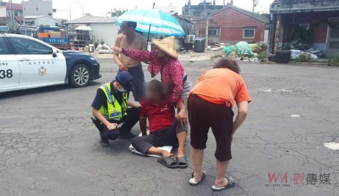67歲的老翁外出購物,一時血糖降低跌坐在路上,熱心路人立即為他撐傘遮陽,恰巧遇到巡邏的警察經過及時救援。