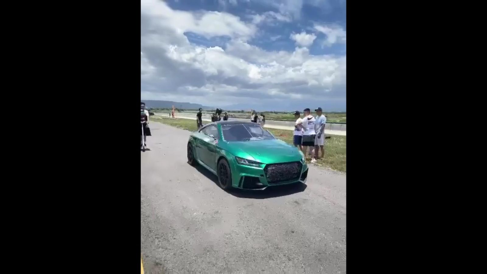 ▲溪州鄉順風飛行俱樂部提供場地給賽車團體舉辦汽車直線加速賽,有著金屬綠外觀的「檳榔號」彈射起步後,車輛在跑道末段翻覆,幸好駕駛僅輕傷。