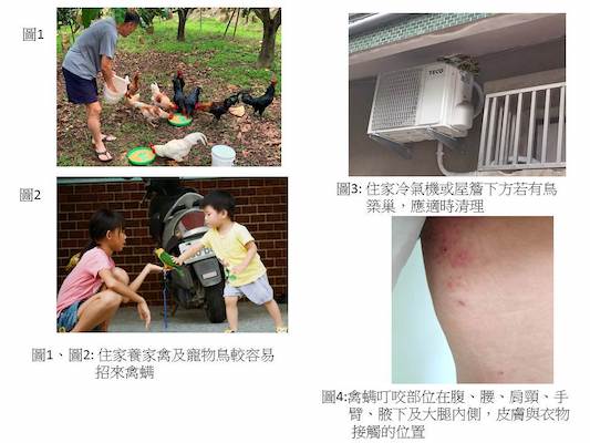 邱醫師提醒,禽蟎無傳播傳染病的風險,因此僅須注意居家環境屋內保持清潔乾燥,如在公園綠地旁,又是鳥語花香的環境、鄰居有養鴿子或是常常有鳥到住家陽台停留,就避免在屋外的陽台空地晾曬衣物、棉被,另注意冷氣周遭或屋簷下是否有鳥築巢,在家陽台周邊設置防止鳥類停留的設施,是預防熱帶禽蟎叮咬最重要的工作。