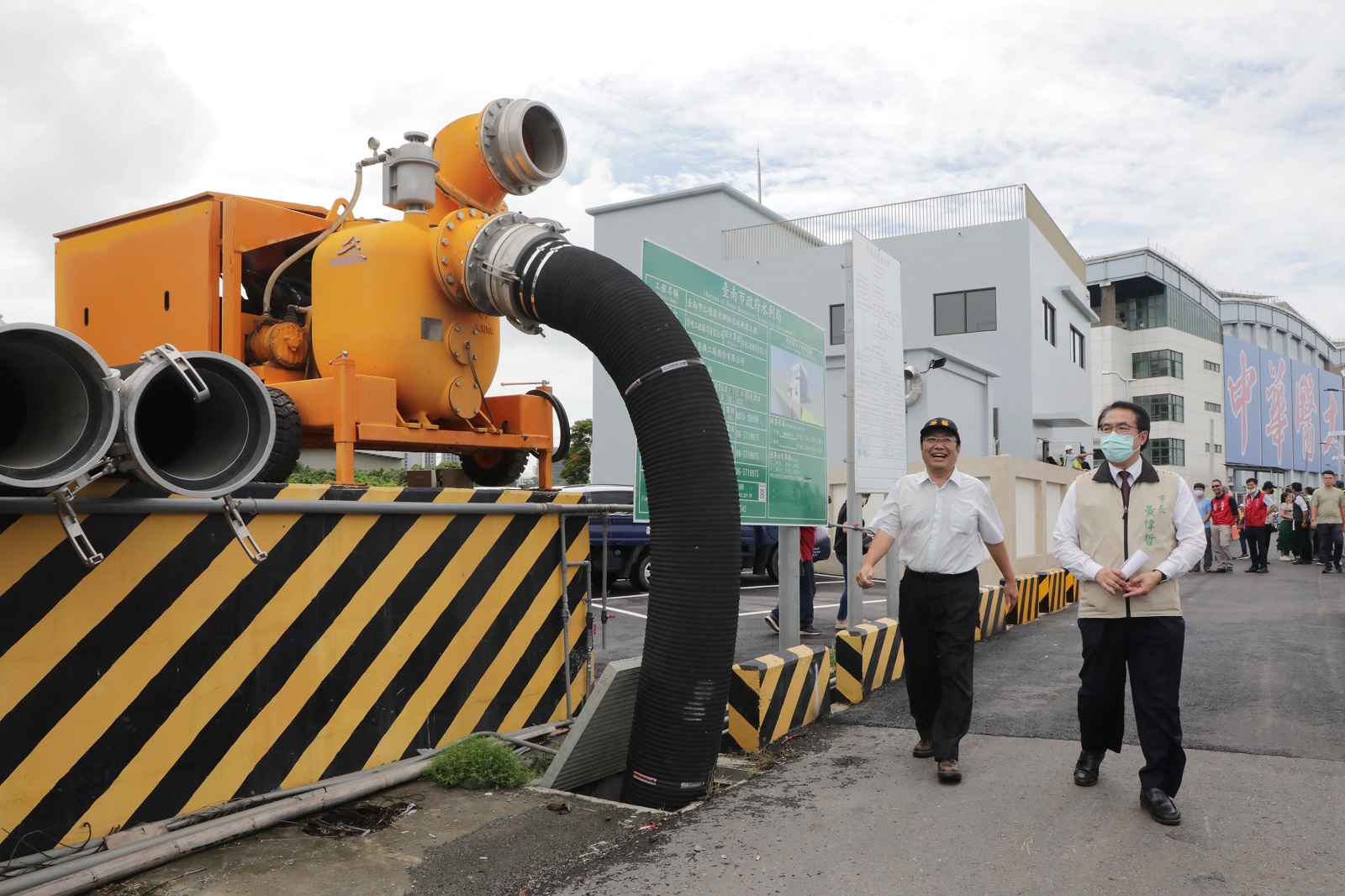 黃偉哲市長表示,本工程歷經工程單位努力及中華醫事科技大學校方協助下,順利趕在汛期前完工並投入防汛工作,猶記2018年0823水災時,中華醫大遭遇嚴重水患,為解決三爺溪周邊淹水問題,市府攜手中央積極推動三爺溪流域整治,也將阻水橋梁改建,減少對水流的影響,另一方面也持續建置抽水站,將低漥處的雨水抽排到河川,特別感謝中華醫大提供將近300坪土地,讓市府得以興建抽水站,也謝謝中央水利署、營建署及地方市議會支持治水經費,崁腳抽水站完成後不僅可紓解三爺溪的水流入校園的機會,也降低對附近居民生命財產安全的威脅,讓附近的生活環境可以因遠離水患提升,並減少市民及學生生命財產安全。