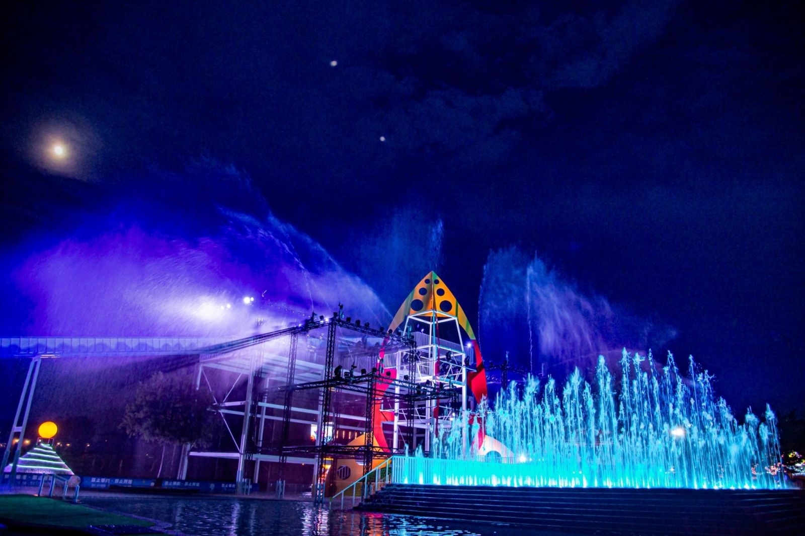 (觀傳媒宜蘭新聞)【記者陳俊傑/宜蘭報導】今年宜蘭童玩節全區視覺設計,以藍色基調呈現浩瀚無垠的深邃宇宙神秘感,除了白天精彩演出之外,夜間園區更是佈滿星球的宇宙光影裝置,水域絢麗燈光結合電音配樂的光影秀,更有歡樂星際派對的氛圍。