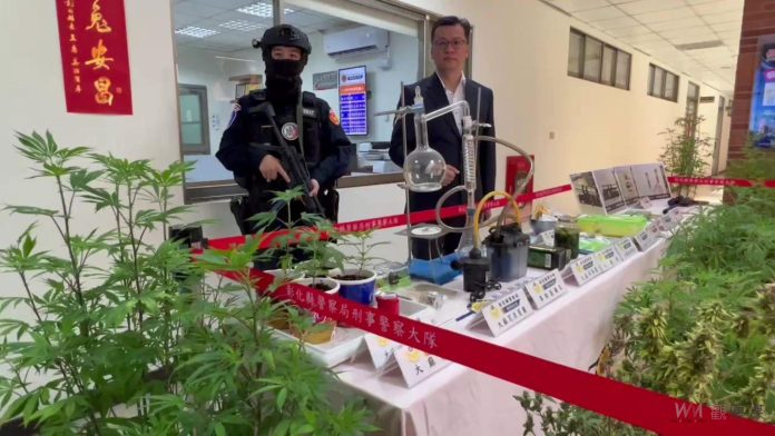 ▲彰化縣警察局破獲販毒集團利用公寓頂樓加蓋樓層栽種大麻、販售大麻花,製成巧克力、大麻酒及餅乾,起出土造電控霰彈槍、霰彈21發、空氣長槍及雷管等。