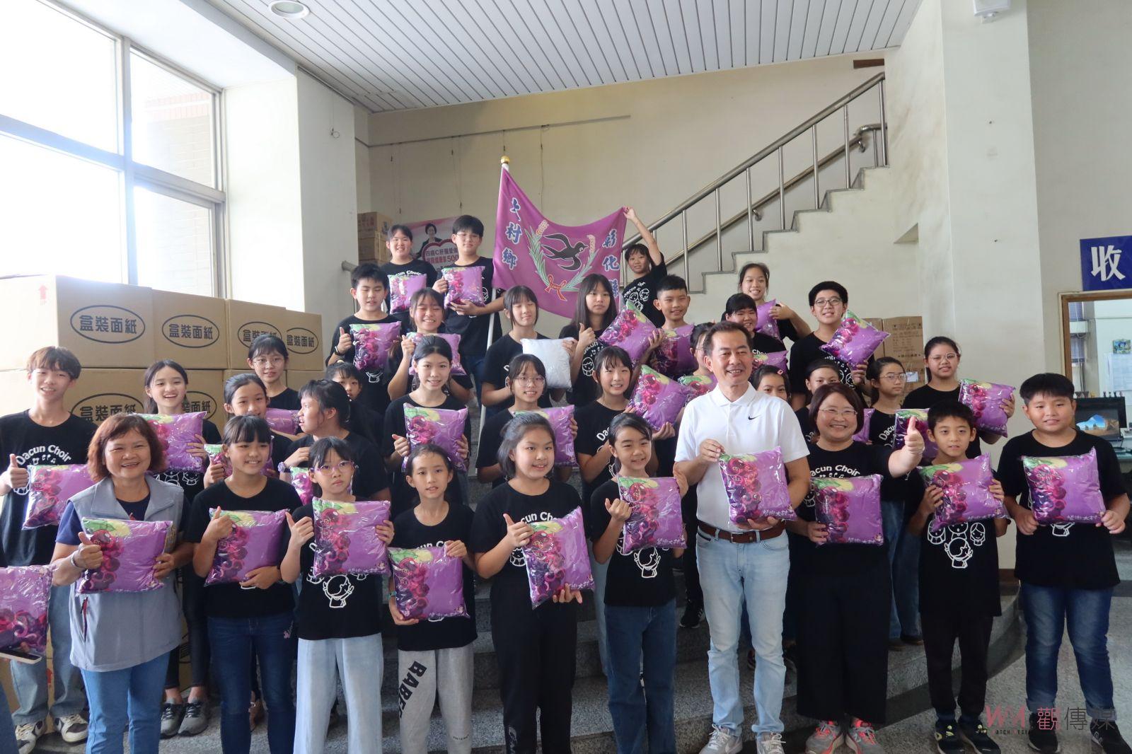 ▲大村國小合唱團獲邀到波蘭參加波蘭克拉克夫國際合唱大賽,鄉長賴志銘授旗,大村國小合唱團特地到大村鄉公所獻「聲」,感謝各界經費支助。