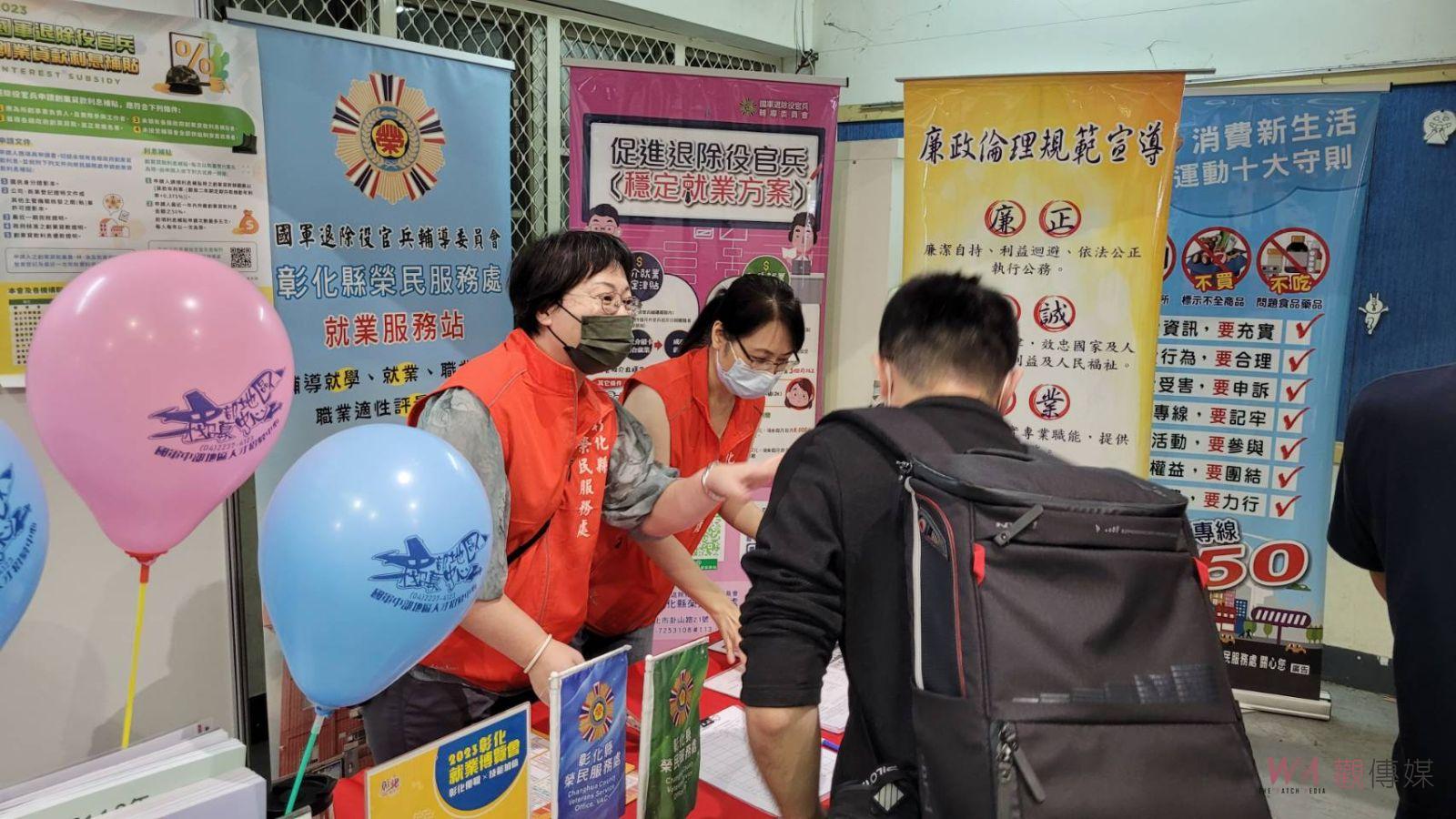 彰化縣榮服處副處長鍾翔宇率就業站設立服務台,服務有就(轉)業需求之退除役官兵及眷屬。榮服處服務台除向退除役官兵及眷屬說明就學就業及職訓等各項權益輔導措施外,活動中並辦理「誠信治理,公私共榮」反貪活動,宣導廉政微電影「幸福˙勻勻仔行」、蔥花麵包的滋味」及消費者保護資訊,以提升退除役官兵及眷屬對個人權益維護與消費意識及公、私部門廉能誠信價值的重視。