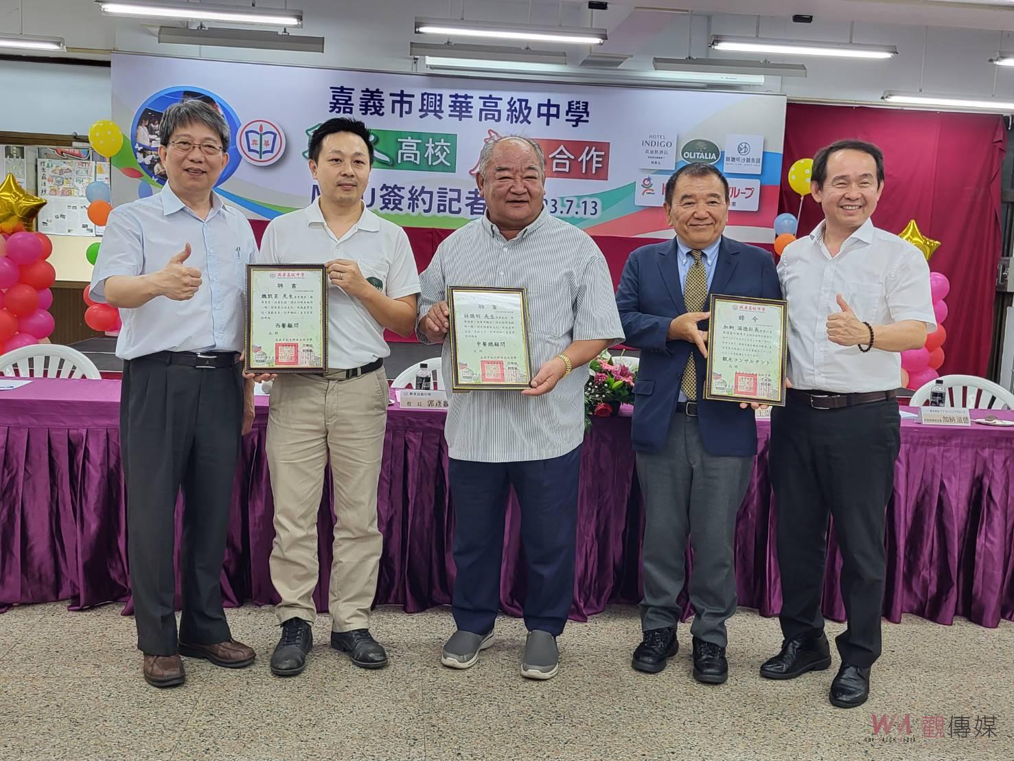 (觀傳媒嘉義新聞)【記者邱嘉琪、郭政隆/嘉義報導】嘉義興華高中攜手台、英、日觀光、餐旅產業巨擘,產學合作培育相關領域人才,13日下午與阿里山英迪格酒店總經理、日本I-Learning 株式會社代表取締役社長 加納 滋徳與協憶有限公司-OLITALIA橄欖油代理魏凱昱經理、林聰明砂鍋魚頭老闆林聰明簽署合作備忘錄,期盼打造大嘉義技職升學就業一條龍服務。
