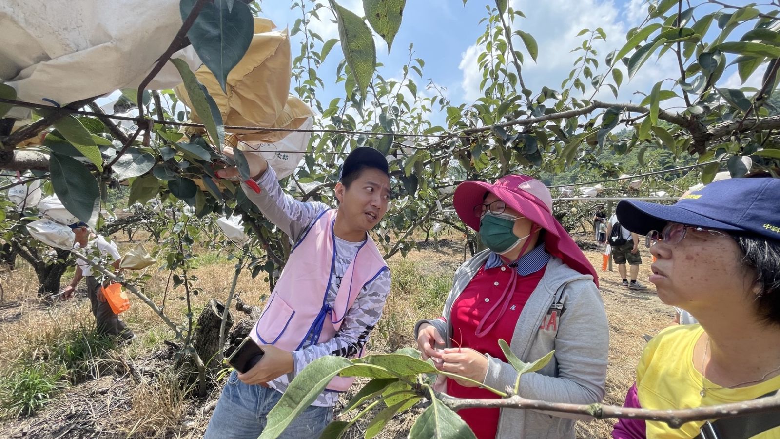 ▲「112年中嵙社區高接梨產業推廣活動」導覽人員採梨解說。