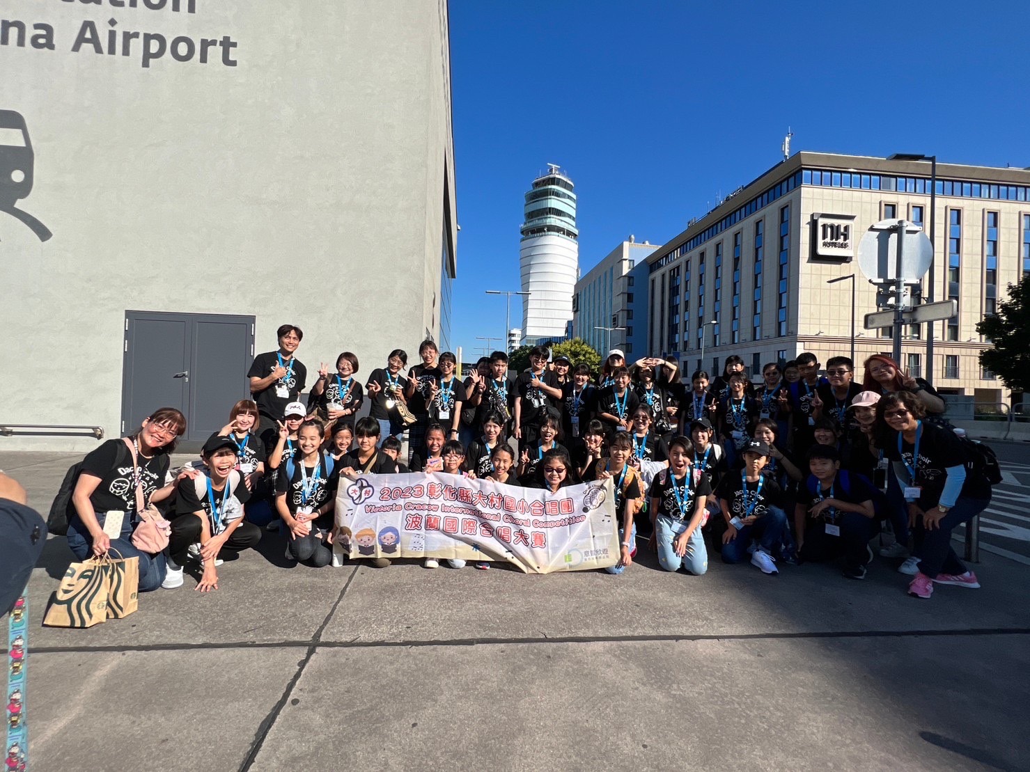 大村國小33名學生,在校長、老師、家長一行共50人7月14日出發,一抵達桃園機場長榮航空櫃台前,一路從桃機、維也納機場、維也納莫札特雕像前、維也納國家歌劇院前都直接開唱。