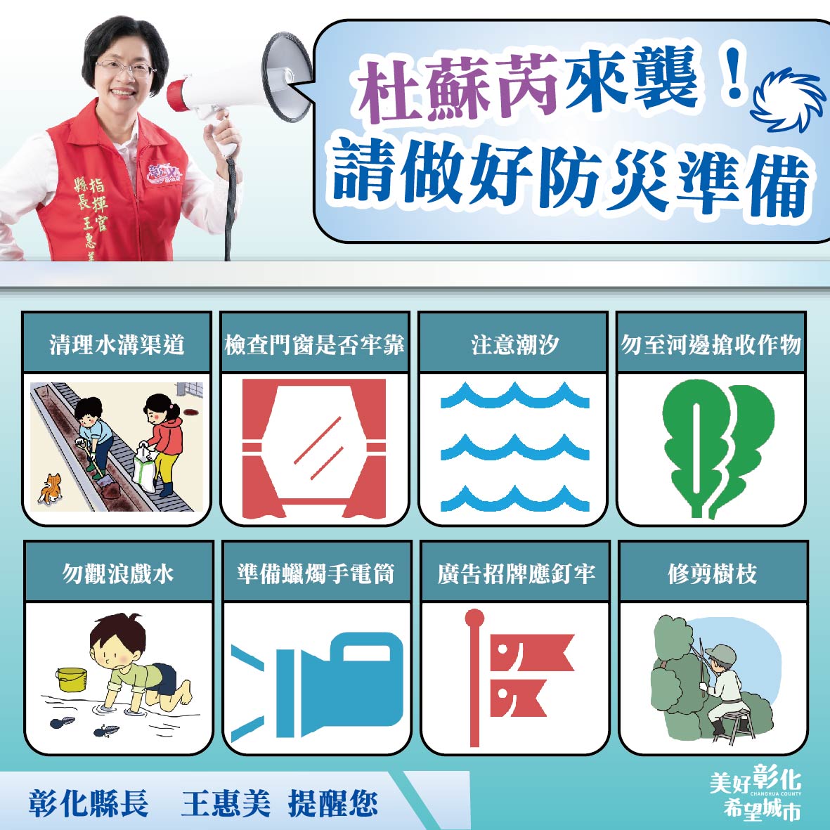 王惠美說,縣府除持續積極準備相關防汛作為外,也將加強各級排水巡查及水情資訊收集,即時提供各鄉、鎮、市公所落實防災概念,共同組成綿密防汛網,同時籲請鄉親颱風豪雨期間千萬不要出門,以免發生危險。