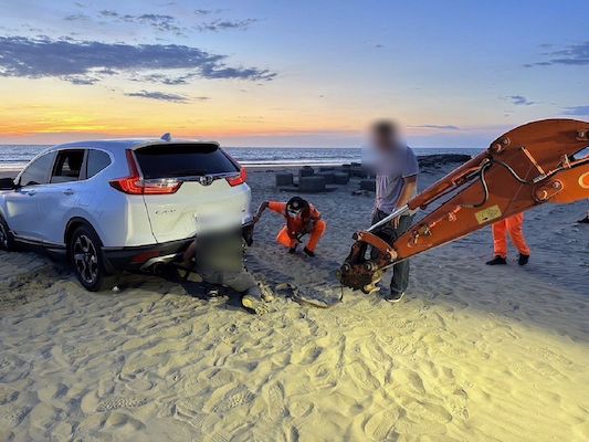 ▲海巡署協助陷沙灘的車輛脫離困境。