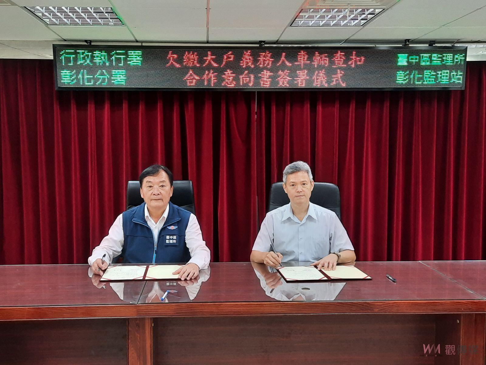 (觀傳媒彰化新聞)【記者陳雅芳/彰化報導】為實踐公法債權收繳,為了杜絕違規者積欠大量違規罰款且拒不處理,交通部公路總局臺中區監理所彰化監理站今(27)日與法務部行政執行署彰化分署簽訂合作意向書,透過與彰化縣政府交通處建立之「註銷號牌收繳聯繫 Line 群組」,建立合作機制,遇有違規大戶之車輛,通知彰化分署執行扣押車輛,以加強違規大戶之強制執行。