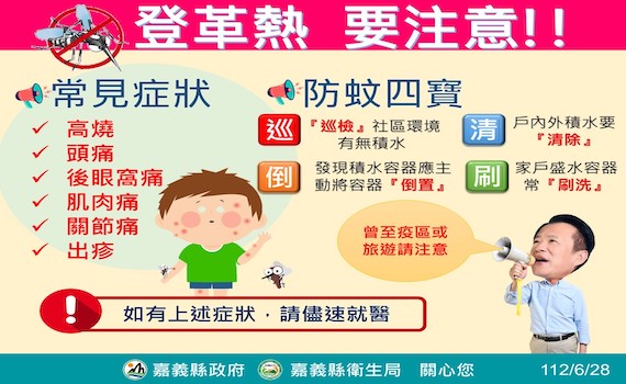 嘉義縣政府表示,截至昨(28)日,本土登革熱病例已累計703例,其中以台南、雲林最多,嘉縣目前雖無病例,但因位處兩縣市之間,生活圈及工作來往密切。尤其颱風過後更應加強巡視各類盆栽底盤、丟棄的飲料瓶罐、廢棄輪胎及大型帆布紛飛髒亂是否有積水,落實「巡、倒、清、刷」四大步驟,從根源消滅病毒孳生;如要到疫區呼籲穿著淺色長袖衣褲,塗抹經衛福部核可防蚊藥劑,若出現發燒、頭痛、肌肉關節痛、後眼窩痛及出疹症狀,應立即就醫告知旅遊活動史並減少外出。