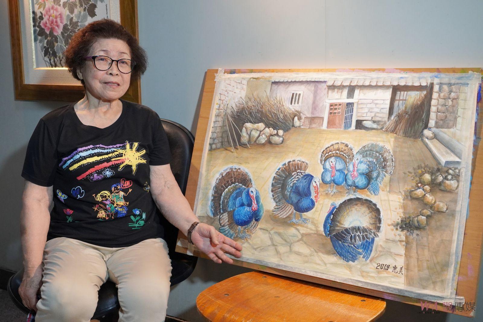 周惠美說,不只是易老師教學認真,學員也會彼此分享經驗,讓她越畫越有興致,常常在想還可以畫什麼主題,前陣子她在附近看到田間有豐收的西瓜,就用寫生的方式記錄下來,小時候曾經被火雞追過,印象很深,幾年前也畫了一幅火雞題材的畫,這些作品都將到成美文化園區展出。