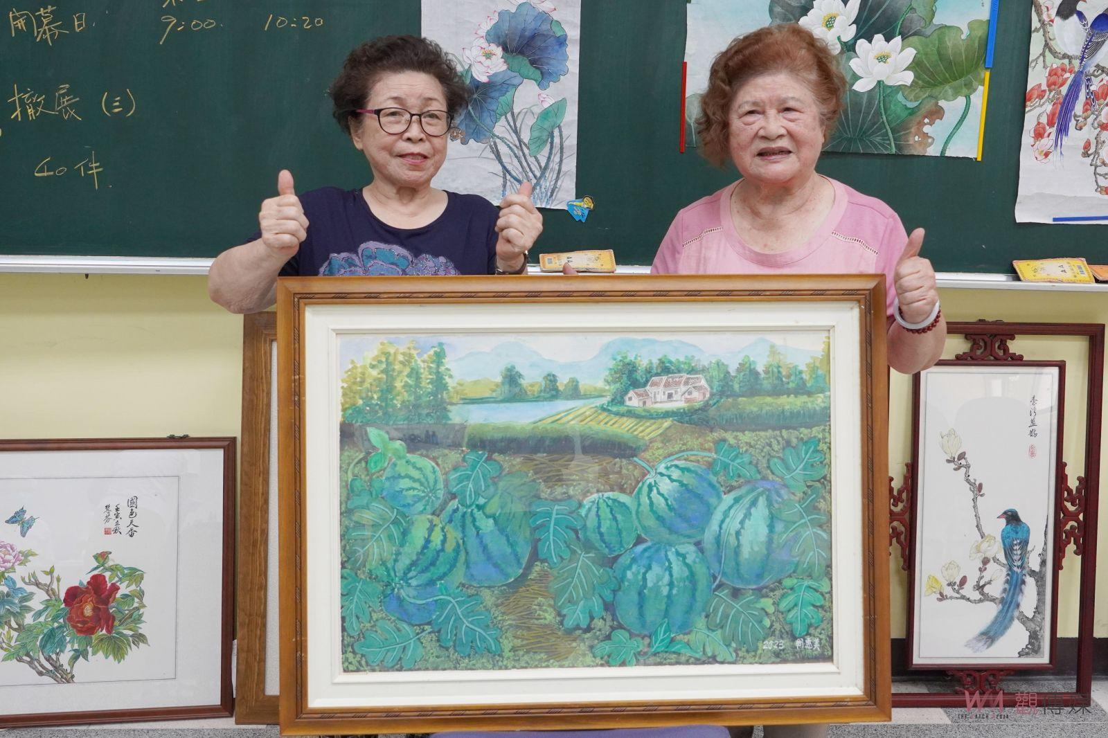 ▲大葉大學長青彩繪班的張含笑(右)與周惠美(左)都超過80歲,他們在畫布上找到自我樂趣。