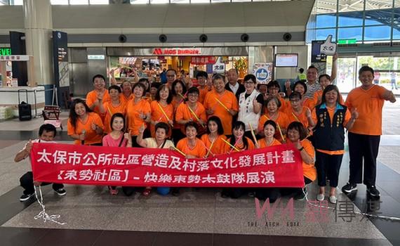 隊中有三位高齡80歲以上阿嬤,東勢社區快樂太鼓隊選在30日下午,在社區理事長徐靜婉帶領下,快閃高鐵嘉義站進行精彩太鼓表演,在太保市長鄭淑分共同加入現場演出下,帶給高鐵站匆忙旅客愉快音樂饗宴,緊湊的曲目表演點亮高鐵站溫馨氛圍。