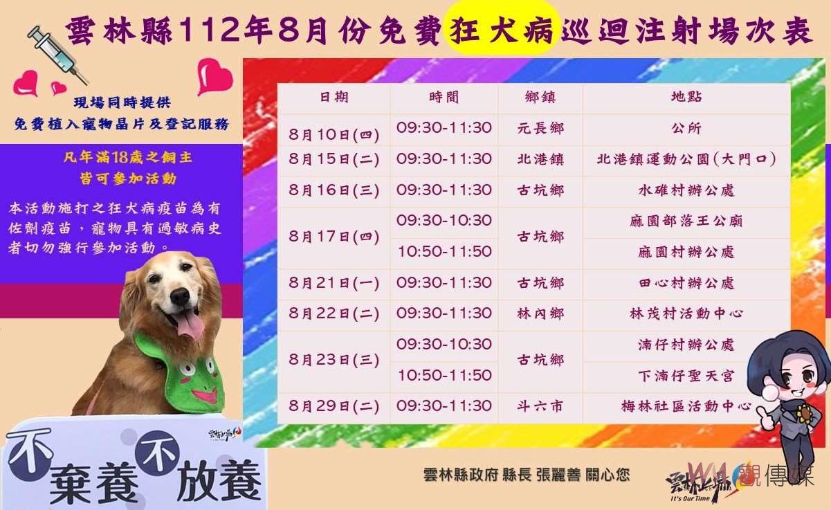 雲縣8月預定於元長、北港、古坑及林內等地區舉辦11場次「免費狂犬病疫苗巡迴注射活動」。
