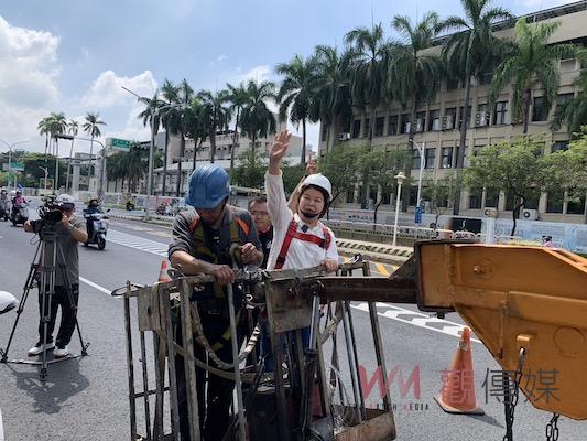 ▲張秀華全副武裝上高空為自己掛上第一幅競選看板。
