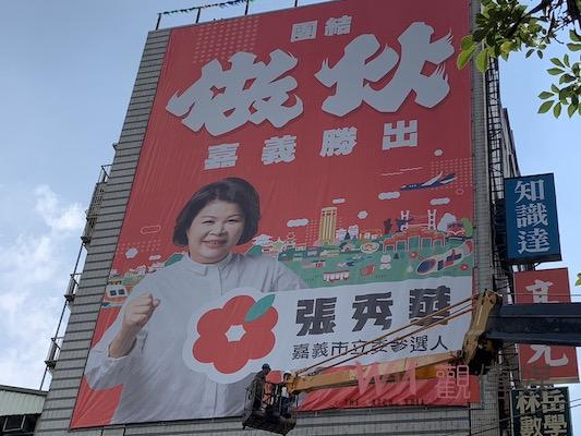 張秀華今天先展現瞻識的全副武裝,親自上20米高空為自己在垂楊路上掛上首面大型選舉廣告看板。他說,整體視覺構成將嘉義市定位為「台灣新都心」,色彩組合選用「狀元紅」輔以湖水綠,呼應從政超過20年以來,努力不懈的熱情與執著自己,且主題強調「團結做伙」。黨籍六位議員全數出席,高呼「團結做伙挺阿華、嘉義勝出一定贏」口號,充分展現國民黨團結勝選氣勢。