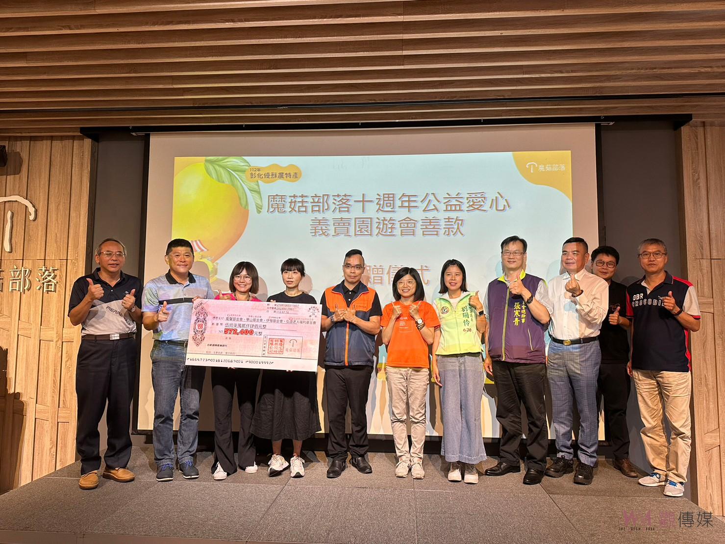 (觀傳媒彰化新聞)【記者陳雅芳/彰化報導】魔菇部落休閒農場日前舉辦十週年暨彰化優鮮農特產公益義賣園遊會,共募得高達572400元的善款,今(2)日將義賣所得將全部善款捐贈給四家公益團體,包括勵馨基金會、華山基金會、伊甸基金會以及弘道老人福利基金會,用於幫助需要幫助的弱勢族群,體現了公益活動的實質意義。