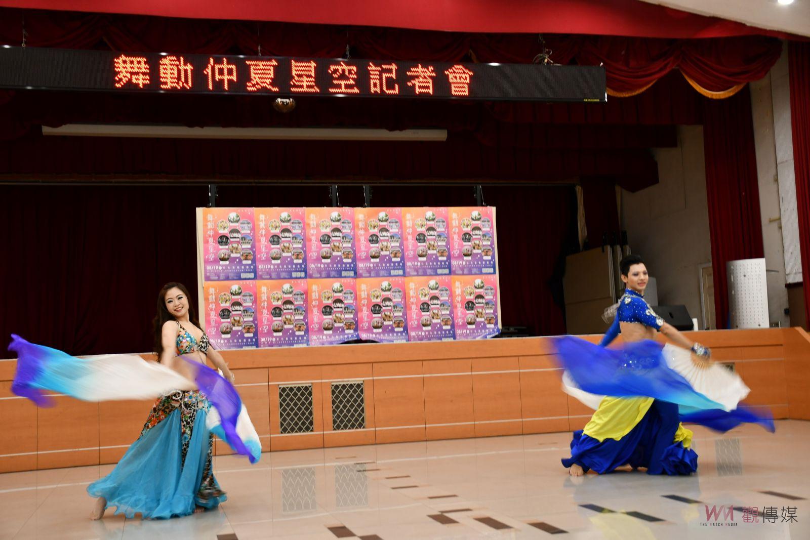 今(2)日由「思媚兒舞蹈藝術團」表演飄傘舞及鼓舞為活動暖場,思媚兒舞蹈藝術團在「舞動仲夏星空」活動將表演,以中東肚皮舞,融合風肚皮舞,夏威夷大溪地舞為主;教學理念:開心跳舞,舞出健康,培養專業技能,給予學生舞台勇於表現自己、健康又美麗用心教學的同時,積極參與地方活動,致力於各種公益團體演出。