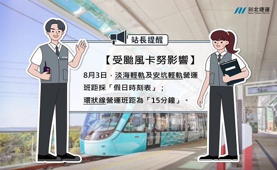 (觀傳媒新北新聞)【記者蔡宇辰/新北報導】中央氣象局針對卡努颱風發布海、陸上颱風警報, 基隆市、台北市、新北市2日晚間宣布,3日停班停課,新北捷運針對停班課,營運班距將有所調整,包括淡海及安坑等輕軌系統,將採假日時刻表方式營運;假日時刻表可至新北捷運公司官網(www.ntmetro.com.tw)查詢;環狀線將採「班距15分鐘」方式營運,請有搭車需求旅客,特別留意搭車時間。