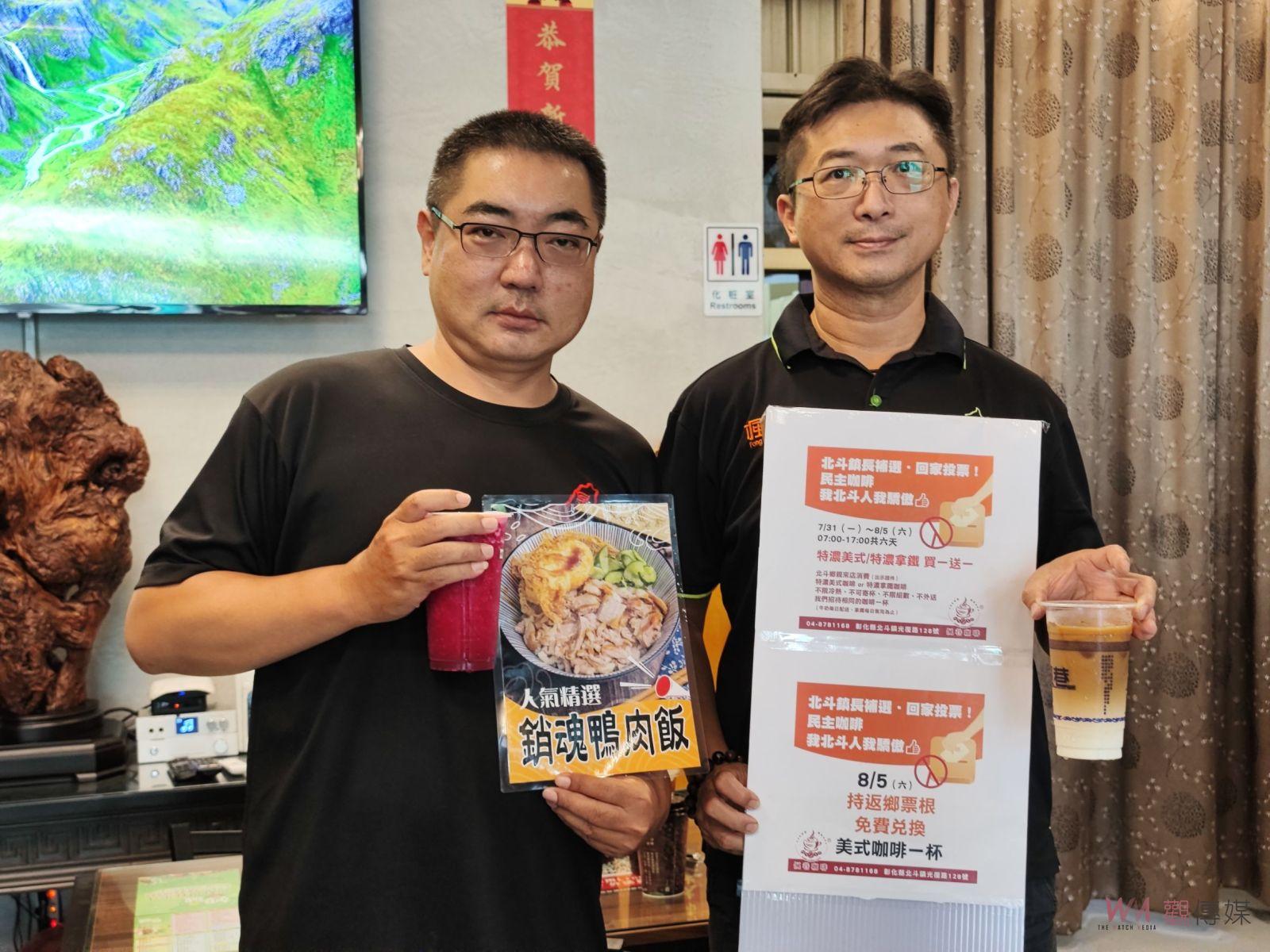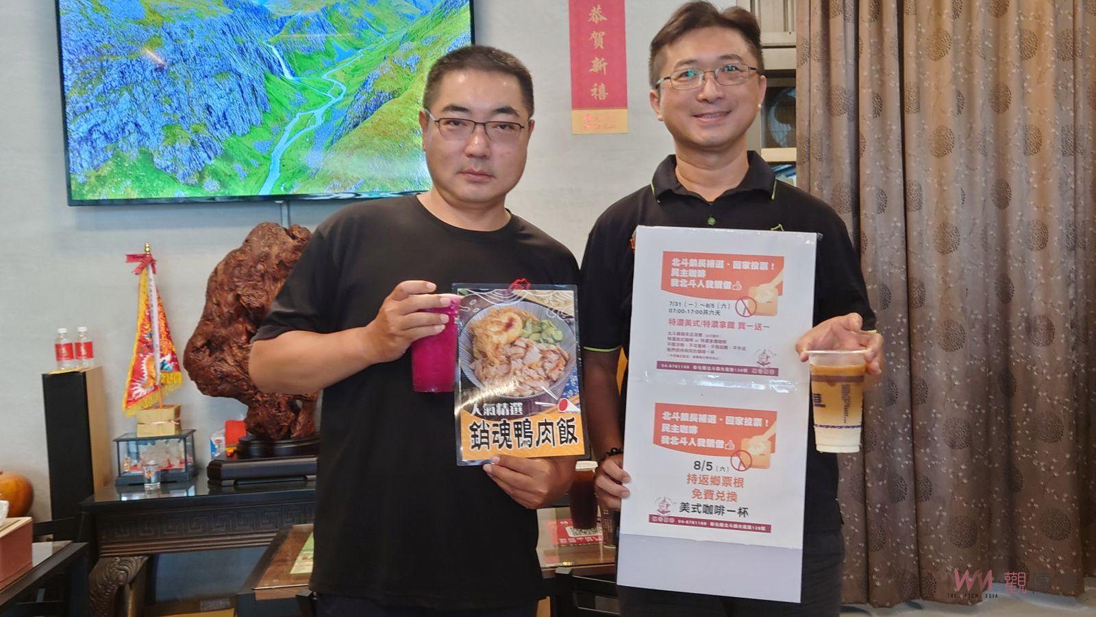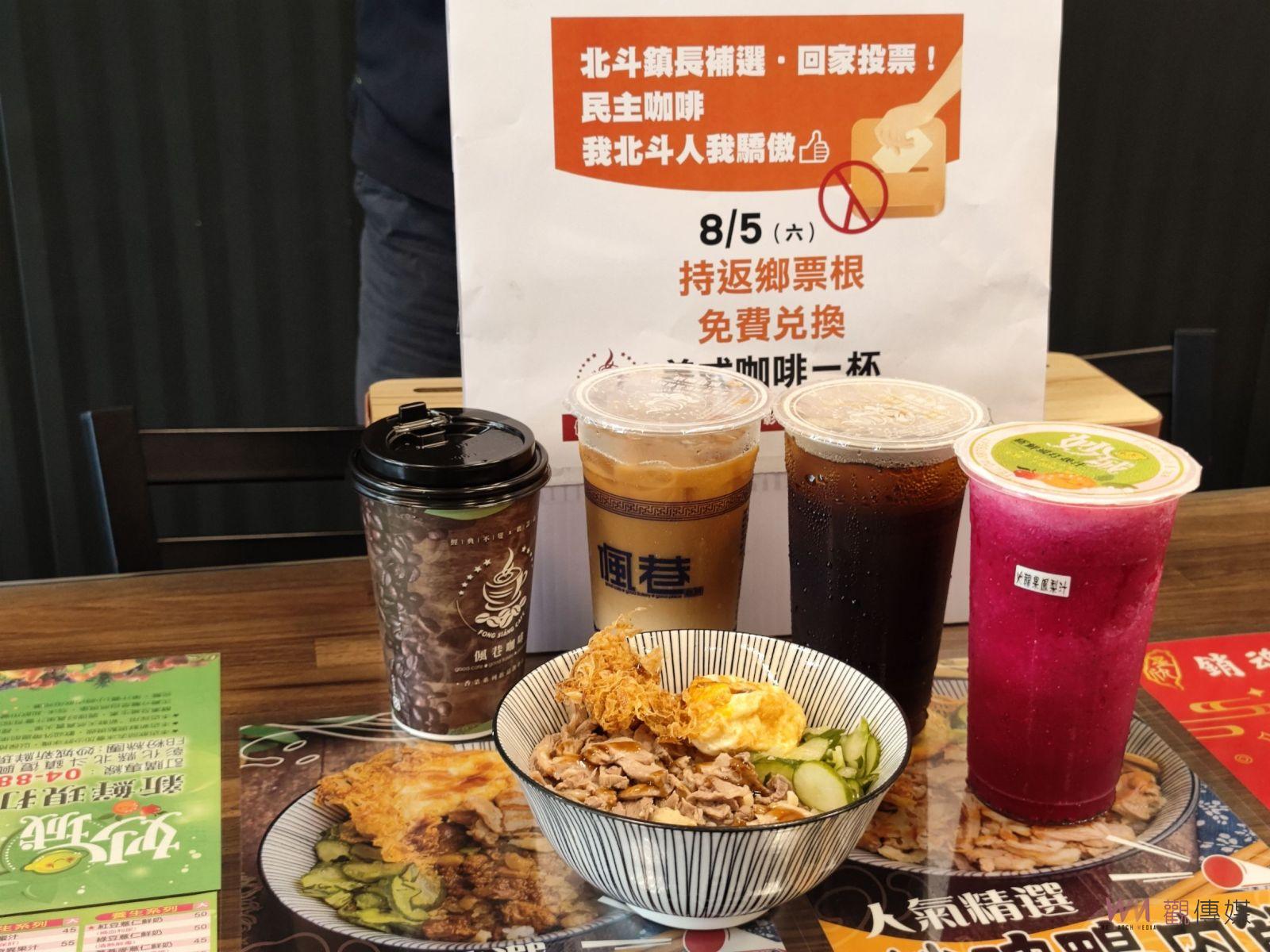 ▲北斗鎮5日舉行鎮長補選,當地餐飲業者發起返鄉投票運動,只要持8月5日搭乘公共運輸工具回彰化的票根,就可免費兌換咖啡、鴨肉飯跟火龍果鳳梨汁等餐點。