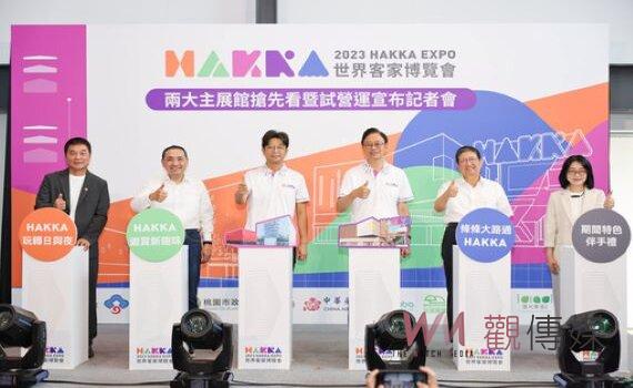 (觀傳媒桃園新聞)【記者潘明賜/桃園報導】2023 世界客家博覽會兩大主展館試營運暨特色伴手禮發布記者會,今(4)日上午在桃園市中壢區世界客博會世界館舉行。桃園市長張善政、新北市長侯友宜、新竹縣長楊文科、苗栗縣長鍾東錦、新竹市副市長蔡麗清等縣市正副首長,到場共襄盛舉。首度舉辦的世界客博會將於11日正式開幕,8日至10日展開為期3天試營運,歡迎民眾先睹為快。桃園是全台客家族群人口數最多的縣市,很榮幸與客委會共同主辦,也感謝14縣市參與,期盼透過世客博讓更多人體驗客家的多元面向,展覽內容豐富精采,相信會讓客家族群引以為傲,也能讓其他族群朋友更加瞭解客家文化。