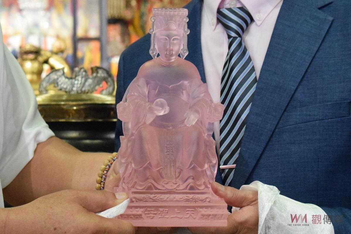 (觀傳媒雲林新聞)【記者洪佳伶/雲林報導】去年藏傳佛教團體領袖與台灣民俗信仰龍頭「北港朝天宮」的世紀會面並分靈「建傳媽祖」供養於台北度母之家,適逢「建傳媽祖」安座週年,今(5)日觀音成道日回到北港娘家,同時分靈主尊首度曝光的粉紅色琉璃的「閨蜜媽祖」手拿龍珠如意寶一起回北港朝天宮。