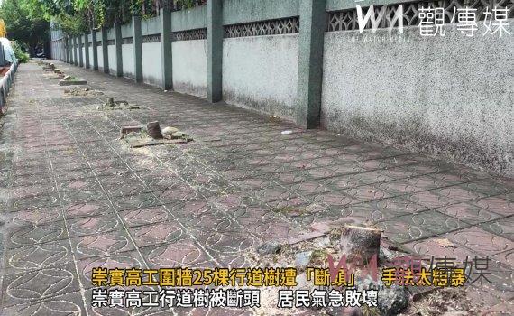 (觀傳媒彰化新聞)【記者陳雅芳/彰化報導】員林市崇實高工後方圍牆種有一排鳳凰木、藍花楹等行道樹,有25棵行道樹遭「斷頭」處理,只剩下樹根,「修樹變砍樹」引起民眾撻伐,竟然連公所及校方對行道樹遭斷頭也一頭霧水,經報警追查,三和里長吳權勝今(11)日才坦承是他僱工人修剪,對於里長砍樹行為是否有正當性,崇實高工說,仍要了解,當初協議裡沒有要求砍樹。