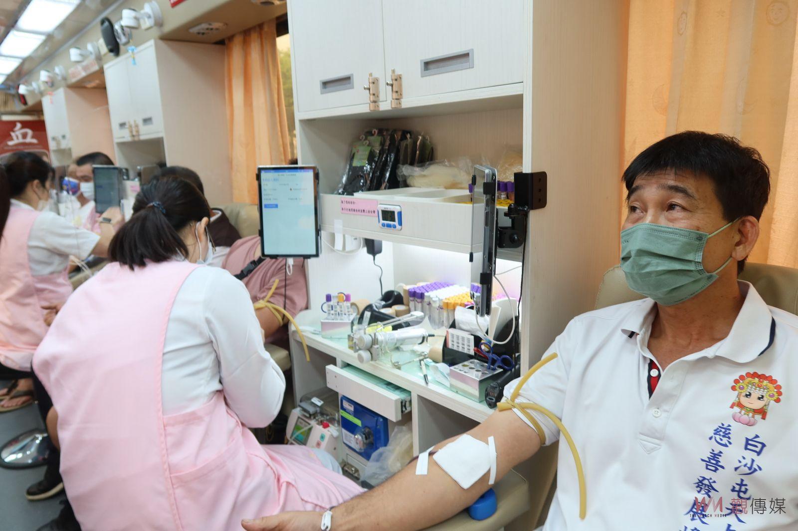 白沙屯天上聖母慈善發展協會創會理事長劉寶連表示,協會成立7年來,公益足跡遍及全台,而為了充實血庫,每年都舉辦兩次的捐血活動,更準備豐富的贈品,每年冬季固定於拱天宮辦理,在寒冬贈送羊毛暖被;而夏季固定在家鄉彰化辦理,在酷暑送上電扇,除了鼓勵捐血也感謝大家白沙屯媽祖的護持,今(13)日雖然豔陽高照,謝謝彰化鄉親不畏烈日,陸續湧入排隊挽袖。