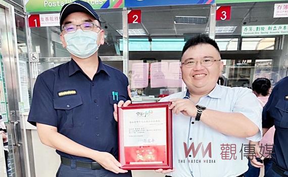 ▲椬梧郵局成功攔阻被害人匯款。分局長陳宏平親自到郵局頒發獎狀及獎金,表揚有功人員義行。