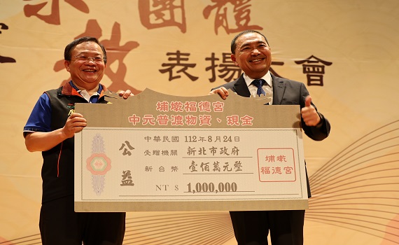 (觀傳媒新北新聞)【記者蔡宇辰/新北報導】為肯定宗教團體貢獻,新北市政府今(24)日舉辦「2023新北市績優宗教團體表揚大會」,由市長侯友宜頒獎,表揚105家績優宗教團體,包括公益慈善、社會教化及個人奉獻三大類獎項。受獎時,埔墘福德宮更直接捐贈600組價值1,100元普渡物資及34萬元現金,市價達100萬元,主委廖榮清表示,非常樂意將宗教資源回饋社會響應慈善,也期盼引起各界共鳴,達到拋磚引玉效果。