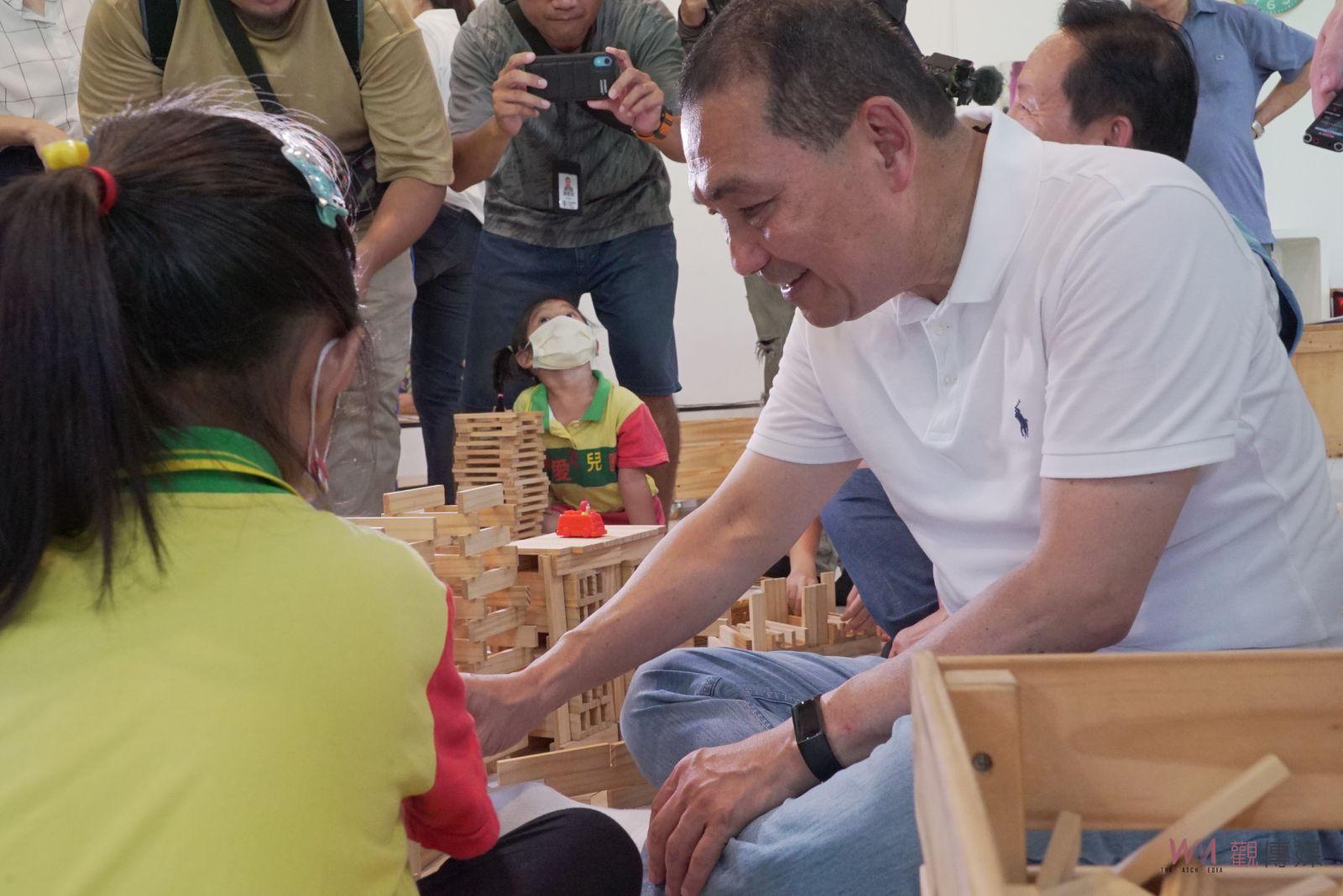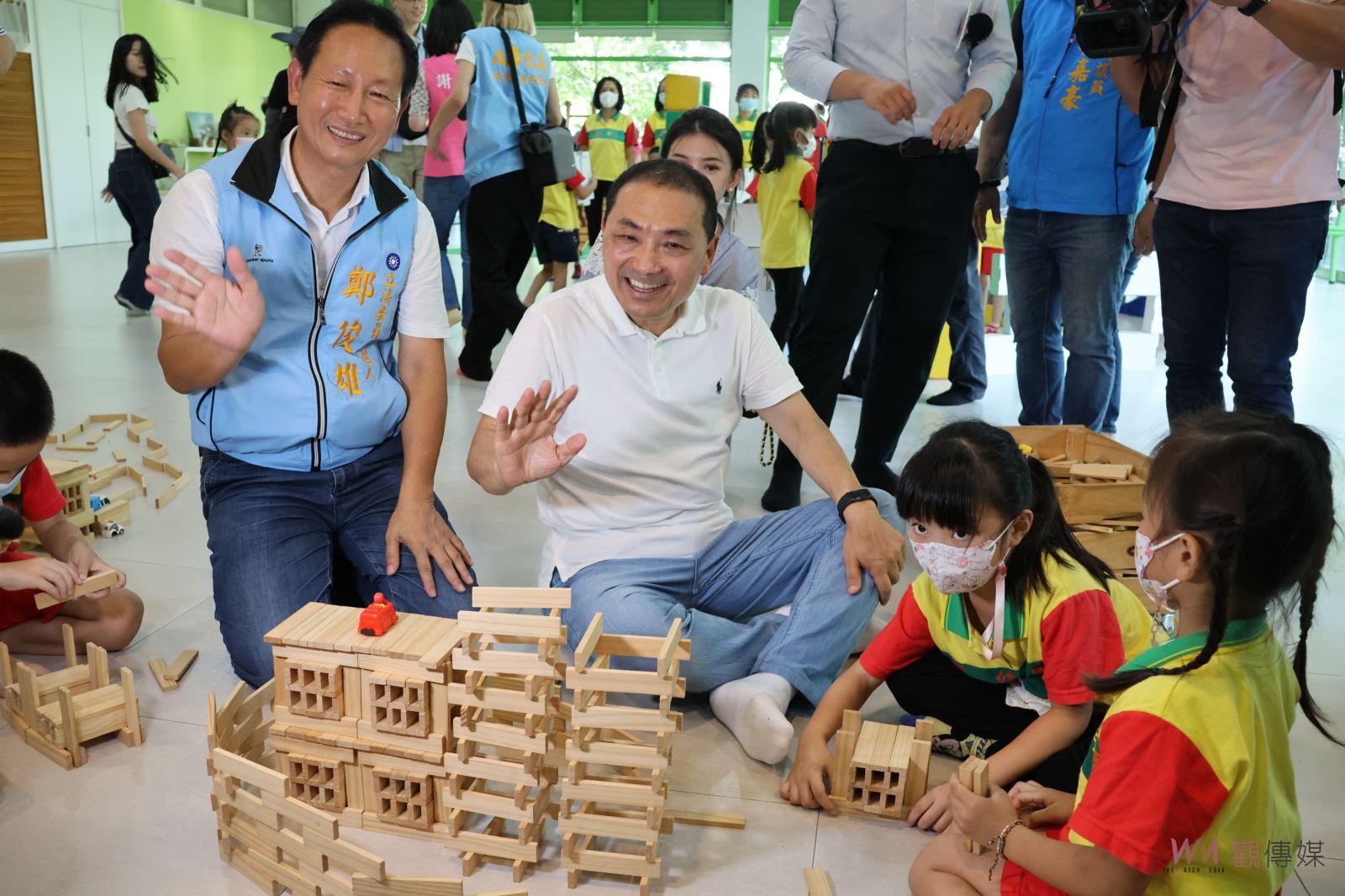侯友宜下午2點左右現身重愛幼兒園,小朋友看到侯友宜到訪,高喊「侯爺爺好」,期間侯友宜陪小朋友在廣場體適能,還到室內玩積木、蓋城堡,侯友宜被問到小朋友是不是比大人還守信用,他笑而不語。