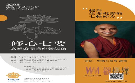 (觀傳媒台北新聞)【記者潘明賜/台北報導】《世界上最快樂的人》一書作者、全球知名禪修大師詠給‧明就仁波切,將於明(30)日上午11時在國立中山大學學生活動中心3樓演藝廳,公開講授「修心七要」暨皈依。台灣德噶中心指出,「修心七要」是提升生命視野的七帖妙方,毋需報名,歡迎大眾直接入場;皈依限未曾參與皈依三寶儀式者,並請事先報名。這是明就仁波切2023年在台灣的弘法之旅之一。