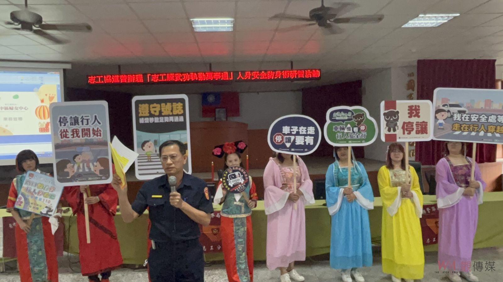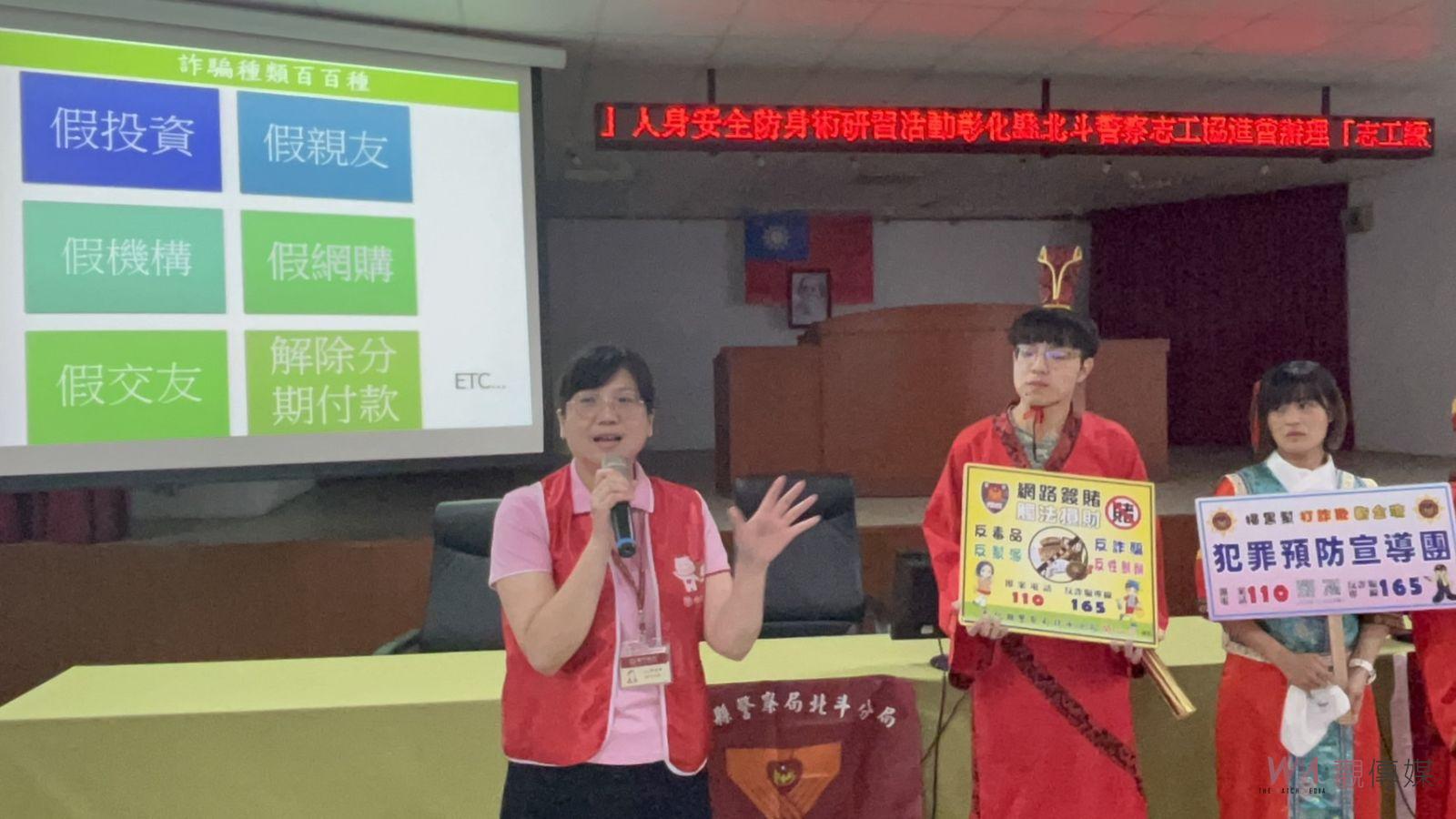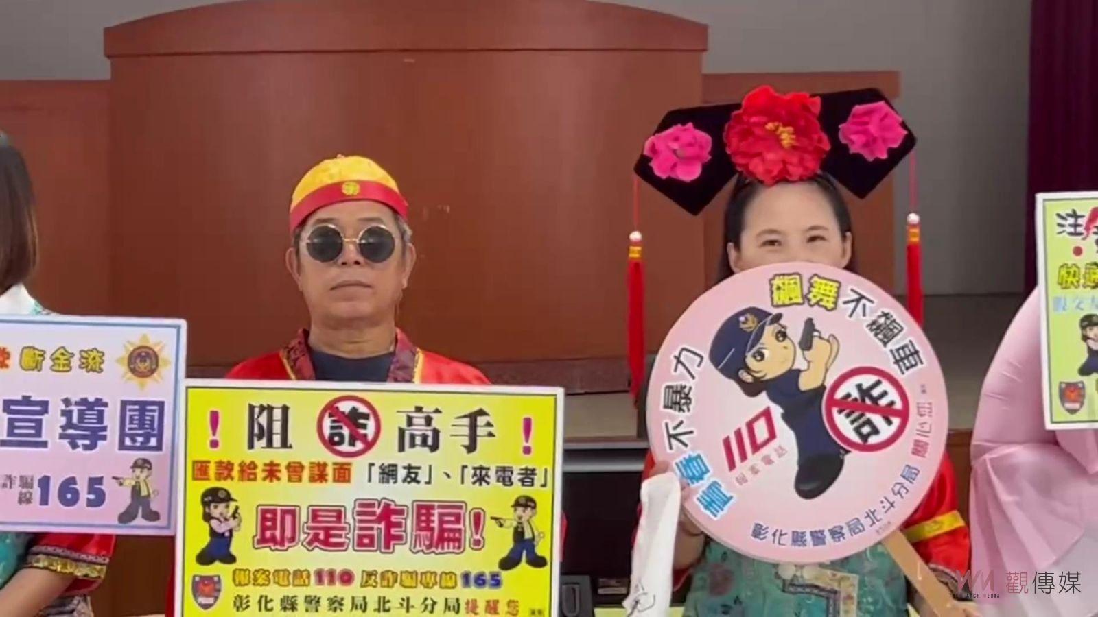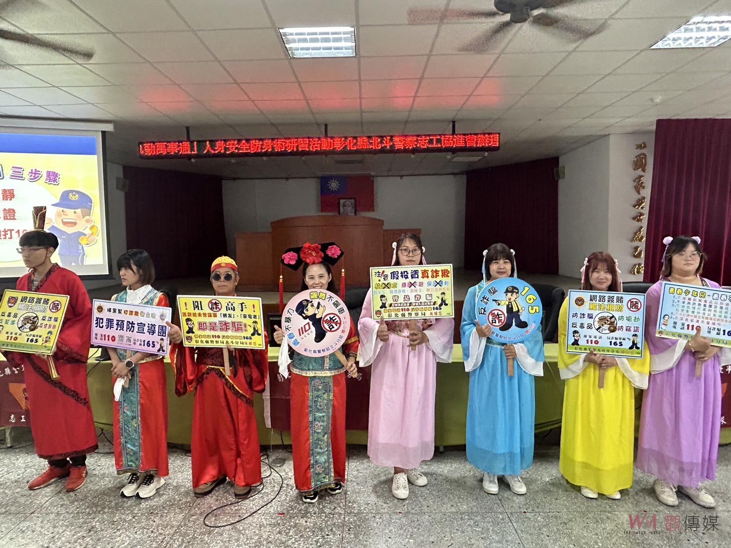 北斗警分局志工協進會辦理防詐研習,北斗警察志工中隊長黃旗旺說,特別安排志工身著華麗古裝戲服,以穿越時空方式宣導識詐,藉此創意方式達到宣導的效果,強化防詐宣導能量,以有效提高民眾識認詐騙手法知能,達到使民眾有感減害之目標。