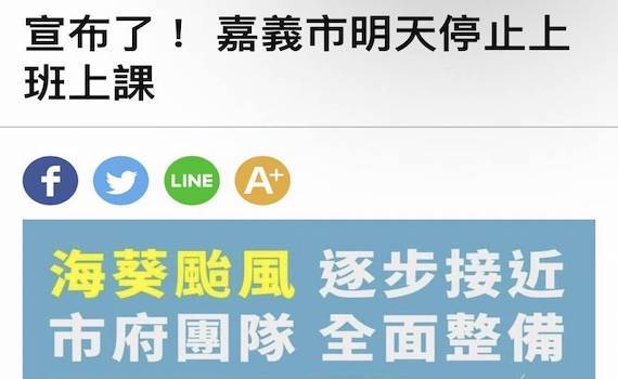 嘉義縣政府因海葵颱風來襲,下午6:03分即依中央氣象局的預報資訊公告,考量上班通勤時間風力已達停班停課標準,且同時間颱風中心位於嘉縣周遭位置,考量瞬間風力及暴風半徑之影響,為維護民眾通行往來安全,本縣明(4)日停止上班及上課。