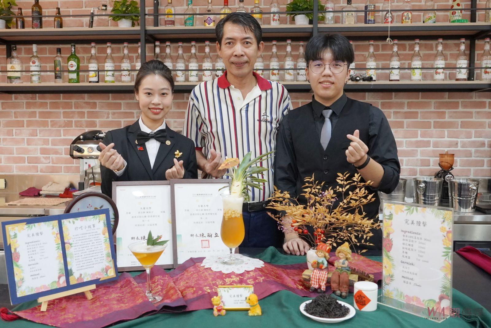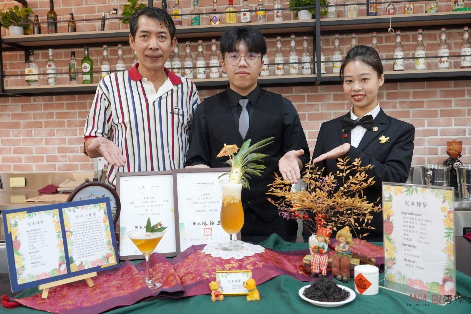 ▲大葉大學餐旅系郭宜靜(左)、烘焙學程陳柏宇(右)茶飲賽奪冠,與陳俊華老師(中)分享喜悅。