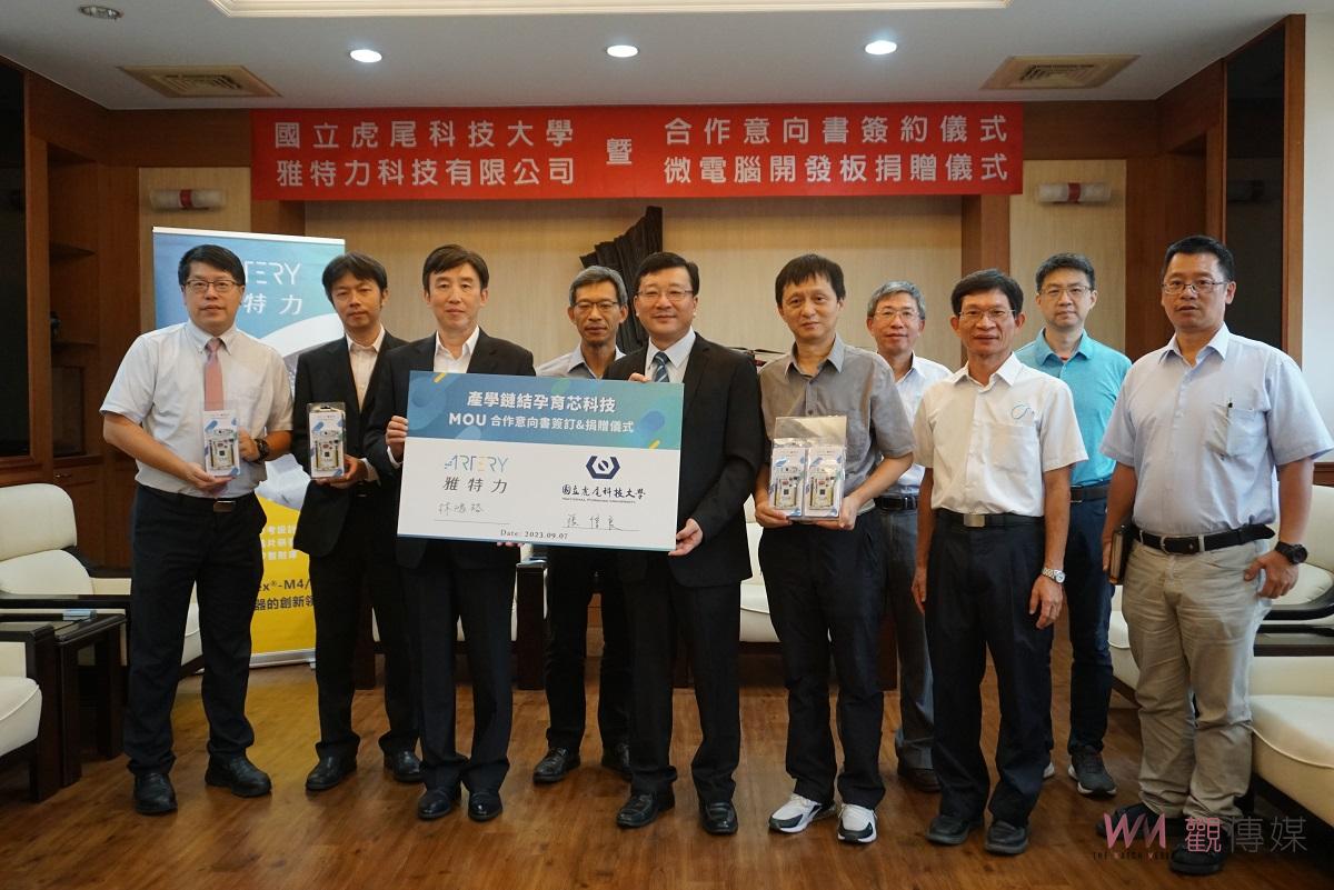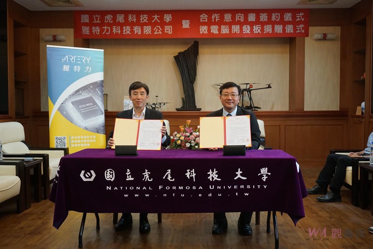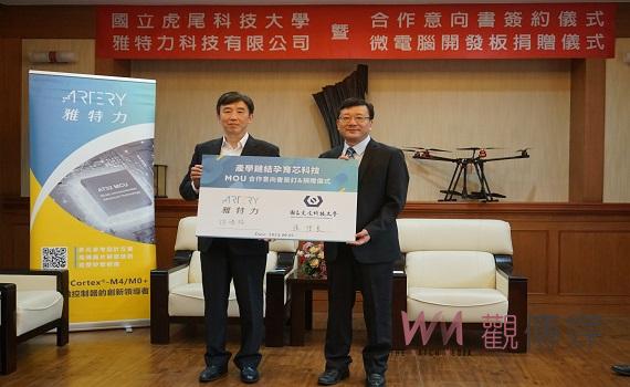 (觀傳媒雲林新聞)【記者洪佳伶/雲林報導】今(7)日國立虎尾科技大學與雅特力科技股份有限公司簽訂技術合作與人才培育意向書,共同培育無人機產業高階專業人才,由校長張信良與雅特力總經理林鴻裕代表簽署,雅特力並捐贈高階微控制器開發系統100套,挹注無人機智能化控制器與驅動器關鍵技術研發。