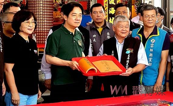 (觀傳媒雲林新聞)【記者蘇榮泉/雲林報導】副總統賴清德携手立委蘇治芬參拜雲林土庫順天宮和虎尾順天宮。這兩座古老寺廟是雲林的縣定古蹟,也代表著地方文化和信仰的重要象徵,賴副總統也於建廟用的磚瓦上簽名認捐,向土庫順天宮捐贈了十片磚瓦,表達對修護工程的支持,他鼓勵更多人參與這項公益事業,讓土庫媽能繼續守護和照顧更多民眾。