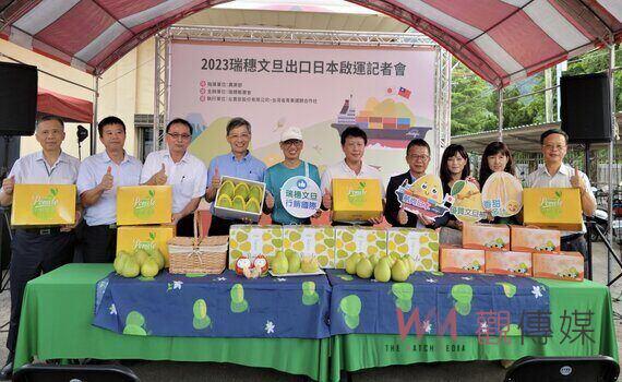 (觀傳媒中彰投新聞)【記者廖妙茜/台中報導】瑞穗優質文旦行銷日本,獲得日本進口商的肯定。今(22)日於台灣省青果運銷合作社台中分社舉辦「2023 瑞穗文旦出口日本啟運記者會」,由農業部、瑞穗鄉農會黃盛皇總幹事、日本一番株式會社吳啟源社長、台農發股份有限公司洪忠修董事長、台灣省青果運銷合作社曾詠松總經理等人一同參加,見證優質文旦柚出口日本首航沖繩啟運典禮。