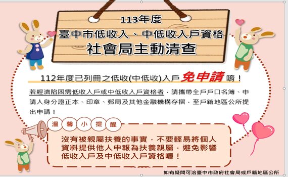 低收、中低收113年度補助資格 中市府10月起主動清查