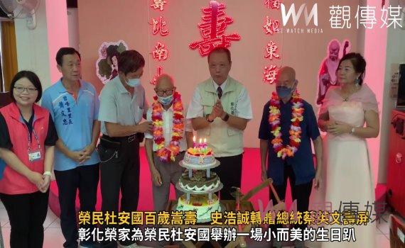 (觀傳媒彰化新聞)【記者陳雅芳/彰化報導】彰化榮家榮民杜安國伯伯邁入了一個令人稱羨的壽命里程碑-百歲壽辰。為了慶祝這一特殊的時刻,今(4)日彰化榮家為榮民杜安國舉辦一場小而美的生日趴,熱情地邀請了彰化縣政府、田中鎮公所、碧峰里社區,以及熱心公益的雅純公益團隊等各界單位,共同參與這個意義非凡的慶典。